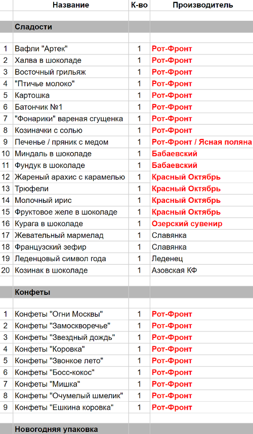 Вафли "Артек" (1 шт), Халва в шоколаде (1 шт), Восточный грильяж (1 шт), "Птичье молоко" (1 шт), Картошка (1 шт), Батончик №1 (1 шт), "Фонарики" вареная сгущенка (1 шт), Слоеные вафли в глазури (1 шт), Печенье / пряник с медом (1 шт), Конфеты "Огни Москвы" (1 шт), Конфеты "Замоскворечье" (1 шт), Конфеты "Звездный дождь" (1 шт), Конфеты "Коровка" (1 шт), Конфеты "Звонкое лето" (1 шт), Конфеты "Семейка сов" (1 шт), Конфеты "Матрешка" (1 шт), Конфеты "Очумелый шмелик" (1 шт), Конфеты "Ешкина коровка" (1 шт)