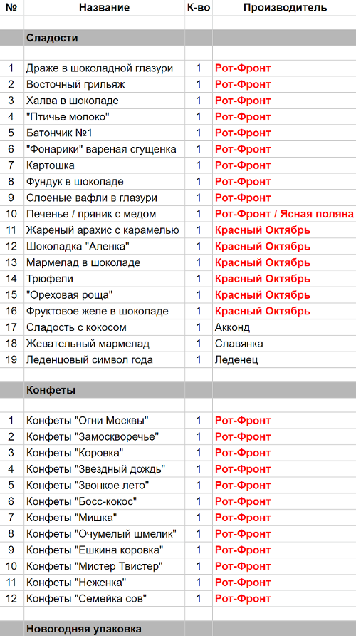 Драже в шоколадной глазури (1 шт), Восточный грильяж (1 шт), Халва в шоколаде (1 шт), "Птичье молоко" (1 шт), Батончик №1 (1 шт), "Фонарики" вареная сгущенка (1 шт), Картошка 1,Фундук в шоколаде (1 шт), Слоеные вафли в глазури (1 шт), Печенье / пряник с медом (1 шт), Конфеты "Огни Москвы" (1 шт), Конфеты "Замоскворечье" (1 шт), Конфеты "Коровка" (1 шт), Конфеты "Звездный дождь" (1 шт), Конфеты "Звонкое лето" (1 шт), Конфеты "Вечерний звон" (1 шт), Конфеты "Матрешка" (1 шт), Конфеты "Очумелый шмелик" (1 шт), Конфеты "Ешкина коровка" (1 шт), Конфеты "Мистер Твистер" (1 шт), Конфеты "Неженка" (1 шт), Конфеты "Семейка сов" (1 шт)